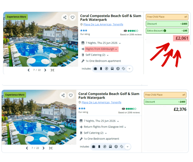 Edinburgh to Tenerife on 25 June 2026 is £2061 for the same holiday.