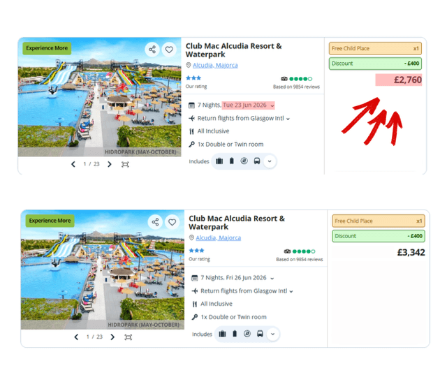 A real example: We want to go to Club Mac, Majorca. Glasgow schools close at 1pm on Thursday 25 June 2026.